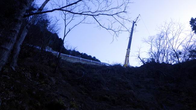 平行には進めないから露岩の縁を伝うようにして上がっていって、工事場の終端近くで大鍋を使ってコンクリを練っている三人組のすぐ脇を通り抜けて林道に戻った。