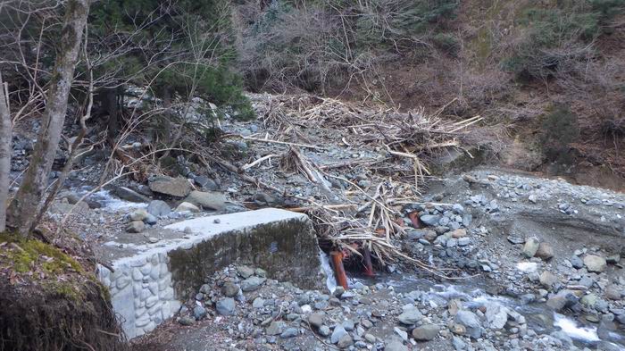 ところが大水が表層の砂泥を流し砂中に隠れていた岩の多くを浚って土石流と引き起こしたらしく、金沢との出会い付近が大石が積み重なる荒々しい幅広な沢に変えていた。