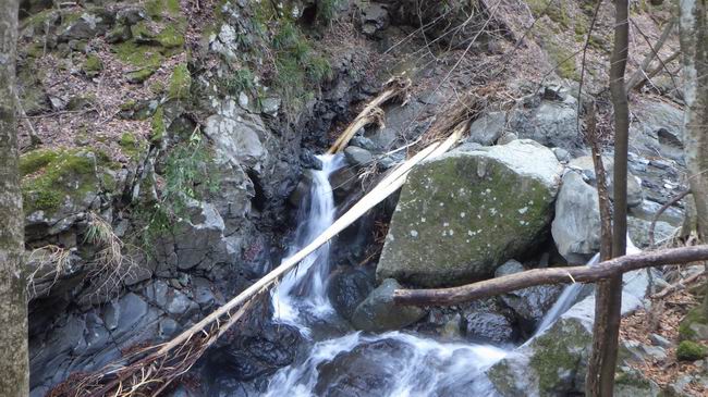 それが右岸の小沢で遮断され、突っ切り行くとすぐ本流に突き当たり、すぐに小滝(2m以下)を超えることになる。