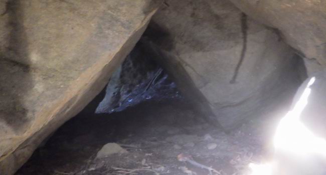それ以上入り込む勇気はなく、引き返して岩の反対面に回って見ると大岩は二つの割れていて狭まった一角に通り抜けるのは無理かもだが、小さく明かり窓となる穴が開いていた。