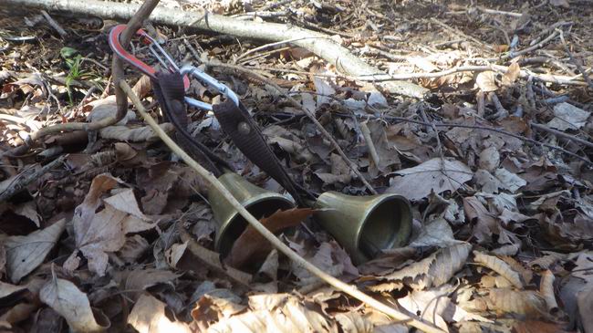 栂立の頭手前の鞍部まで降りてきて、そこで先ほど休憩したところに熊鈴忘れてきたことに気がついた。