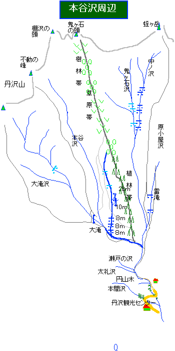自宅4:40〜丹沢観光センター6:19〜伝道6:29〜雷平〜出会い7:10〜尾根8:22〜鬼ヶ石の頭8:58〜鞍部9:06〜鬼ヶ石沢 中の沢乗越沢 (訂正) 〜雷平10:35〜観光センター11:34〜自宅12:50 2000.7.1