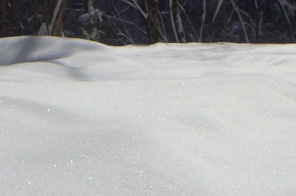 魚止め橋から脇道に入って伝道まで行く間は、日の当たる雪面がきらきらと輝き、まぶしい。このままだったら雪目の心配をしなくてはならないくらいに。