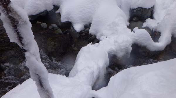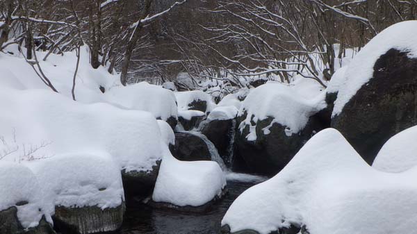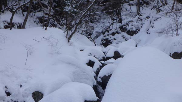 ただ疲れた体であっても、下りの惰性が付いているので、ちょっとしたバランスで前にこけやすい。雪がショックを柔らげてはくれるが、足を取られ手を突いて支えたにしても、顔に着いた雪って冷たいなあ。少し冷たいのは許容の内にして、面倒な飛び石は無視して水に入れば楽だよ。往路では許されなくても帰るだけの往路ではこの手が使える。