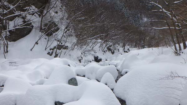 本間橋から奥は雪が一段深くなって、吹きだまりの新雪分30cmくらいか。予想よりちょっと多い。この先はどうなるかの不安?がちょっぴり湧くが、「大丈夫!!」と打ち消す。