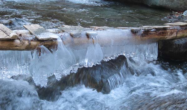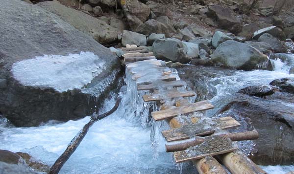 ただし全長4〜5mの橋は、流水の上10cmほどの位置にかかっているので、飛んだ飛沫が凍結して全体が氷に覆われている。