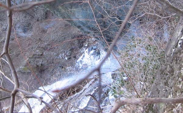 橋の下流3mに距離2m程の飛び石があるが、対岸の岩は瀬川に傾いている上に、表面は凍っているらしく、もしもそこで滑ったら下の渓流に全身転落は間違いない。