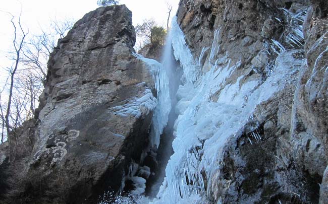 だがくっつきさえすれば、お互いが突っ張りあうので、少しくらいの暖気では氷が岩から剥離して落ちてしまう何てことは無くなり、それによって滝本体に急激に氷結が進む。