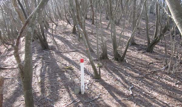 P732mで頭の中での進むべき方向は明らかに直進なのに、左手にテープ標識と見通しの良い尾根があったので、「まっ どうでも良いか」と、マークテープに従う。