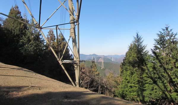 それくらい長く下った気分の頃に、小さなピークを一つ越えると杉の木立の向こう側20m程の位置に鉄塔が立っていた。