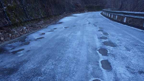先々週よりは凍結面の厚さは減ってきているが、滑りやすさに凍結の厚さは関係なく、凍結面が有るか否かと、その表面がタイヤが食い込むほどに柔らかいか固いかだ。