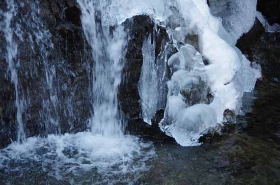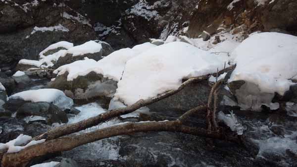 そう思うからか、滝壺手前に漫然と立っているのが怖くて一時も立たっていたくなく、でも足元は氷っていて踏ん張りが利きにくく、結構やっかいだ、アイゼンがあった方が良い、絶対に必要とまでは断定しないが、無いでは実際に落氷があったとしたら素早く動けないだろう。