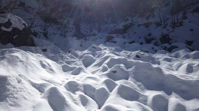 下りの勢いのまま歩くので、つい気がつけば踏み跡をはずれていて、日陰の深い雪にはまってもがく。