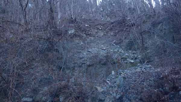 夏場なら杉の根が岩の上に階段がわりにできて、代用できるのでロープを必要と思うことはないが、木の根の着いた雪が凍り付いていると足元が滑らないかと不安になる。