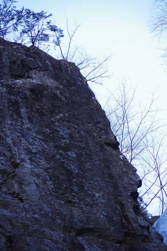 いくらかは枝に邪魔されるが、それでも下方30m(滝の中段;下からは前衛の岩に遮られるところ)の分厚い青氷でできた花瓶の底のような所に向かって吸い込まれるように落ちていく水が見える。
