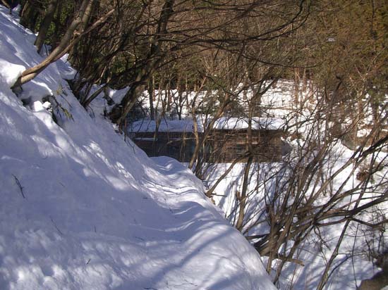 山の陰側にあたる橋からの林道は一面の雪の世界となる。