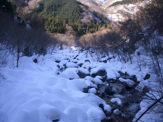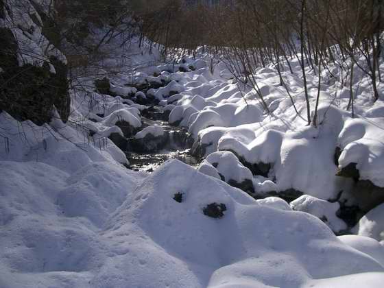 もう少し高度の上がった沢の中なら、少しはサラサラ雪が固まった堅雪かもしれないという期待が無いわけではないが、