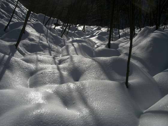 林の中でズボズボと踏み抜いてしまう雪に苦労する事は普通だが、こんな氷の表面の雪だったら、密林の中をずっと木登りしなくては登れないだろう。