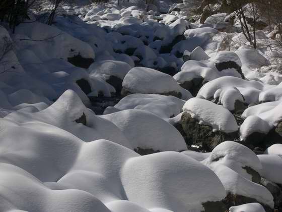 流れの中の小さな石の上の雪は、薄いガラスの板の上と同じで、横方向への抵抗力なんて無い。