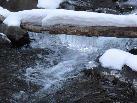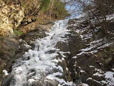 には、分厚い床氷が一面に張っているので、もしも、この寒波が、もう三・四日続けば、そのポイントから上下左右に氷が一気に拡大して広がり、それに滝本体の滝壺から上に延びる氷筍状の氷と接続して全面凍結したバーチカルアイスの見物も夢じゃないかも! なんて想像もするのだが、寒波は昨日までで、今日からは暖かくなると聞くと、今冬の着氷状態も、これから先はそれほど変わらないのだろうか。