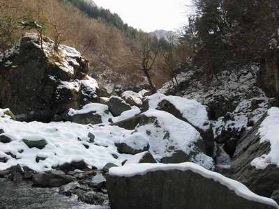 雪の積もった大滝は見たくて来てみたが、冬の河原を歩くのはきつい。徒渉点を前にして何人かが躊躇して引き返したのだろう。
