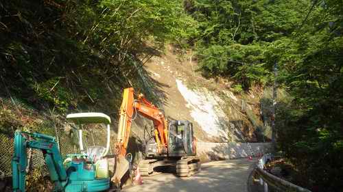 本日に限って言えば休工日。道路上に重機以外に障害物はなかったが、当分の間、車は入れない。また修復されたとしても、これからの梅雨の終わりの大雨があれば、また何処かしら崩落して通れなくなるような場所はまだまだたくさんそこらにある。