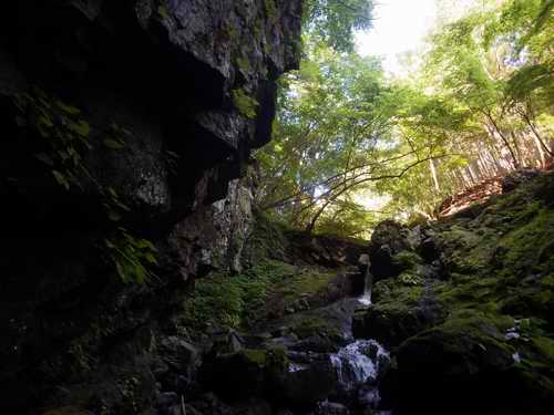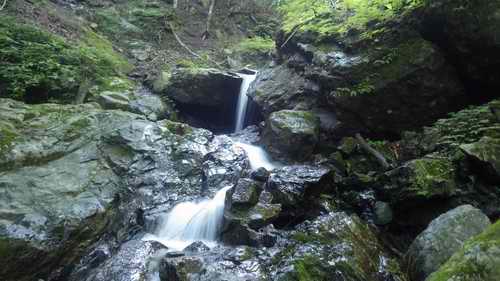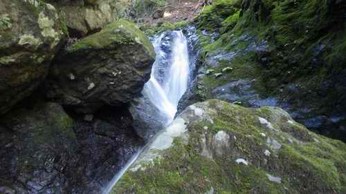 滝は緩いが、岩には薄く水垢のような苔が這えていて