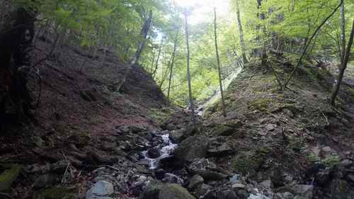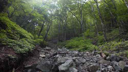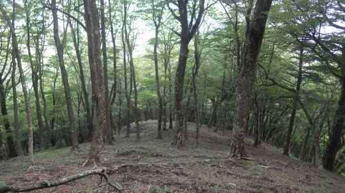 百mほど下ると、わずかにふくらんだ尾根の上に乗る。そこらは下草が低いブナの林だ。