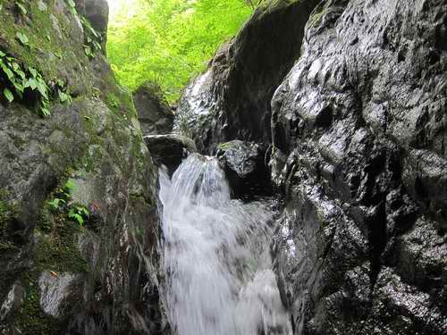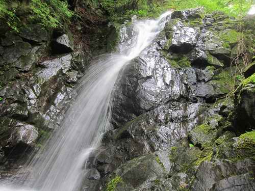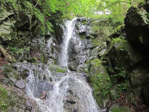大滝は3m程の小滝の上に、十数mの高さに立つ黒々とした一枚の大きな岩の立ったスラブで出来ている。