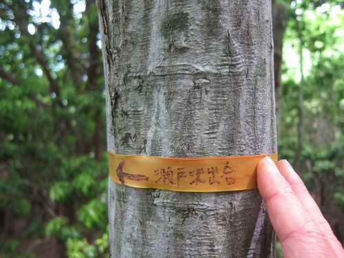 の入り口を示すマークテープが木々に一巻きされている。