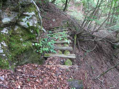 山小屋を作るなら、こんな場所は上からの落石の懸念が少なく、山の強い風が遮られて、水を得るのが楽なので一寸休みにする場にするには良い場所だと思うが、湿気が強すぎるのが嫌われたのか小屋跡らしき物は見あたらない。