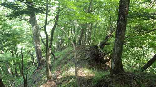 何時までも続くと覆われたそんな傾斜地。振り返り、木々の枝間からを見通すと姫次から原小屋沢・榛の木丸にかけてのザレ地が手の届くような位置に見える。