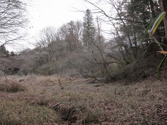 低地を奥に向かって歩き、民家が隠れたところから小尾根に移る。