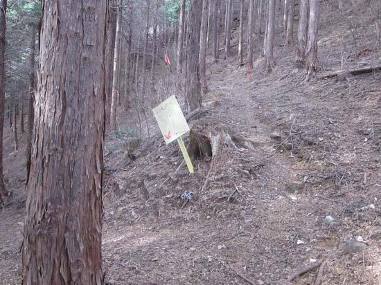 水平林道とは別に山に登っていくらしい新しめのブル道が一本走っていて、そこは「この先は登山道ではありません」の表示がある。