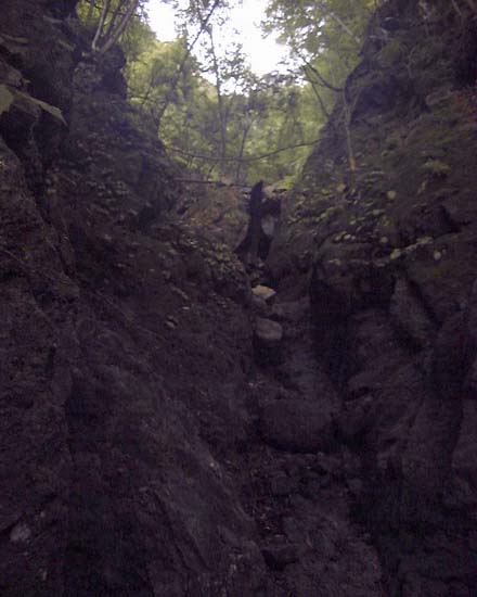 関門状10m程の涸滝(傾斜は見かけ倒しで簡単)を越えて、最後の詰めは絞まりきっていない小石と泥のザレに足元を取られ、3歩上がり、2歩ズルズルしてを繰り返して森林帯に入る。