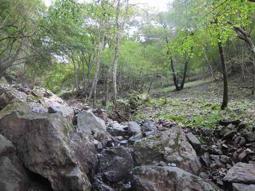 そうこうしている間に左手に沢、右手も沢状になり、そのどちらにも石積み堤が出てきて、