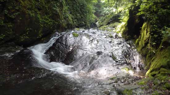 狭い流路を持つ小滝(3m)は右岸側の岩場に逃げ、その先の小滝は左の岩場にセットされている虎ロープを頼りに腕力で登ってから、水平に5m進んで小滝上を滑り落ちる覚悟をしてから対岸に移る。