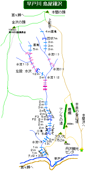 自宅4:45〜鳥屋鐘沢出会6:10〜本間の頭9:50〜1043mピーク手前から鳥屋鐘沢に続く尾根を下降〜途中とうとうF2上に下降する〜鳥屋鐘沢早戸川出会11:40〜暑い中を自転車でよたよたと自宅へ13:05 2001/07/14 暑い夏の日でした。