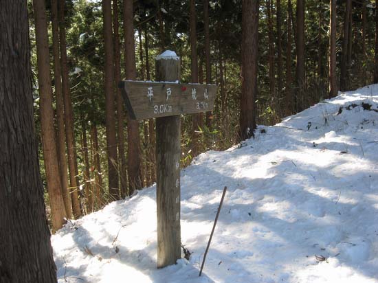 先行者の跡は平戸口から付けられていて、標識の前で三歩ほど足踏みした跡を残して先ほどの周回道に降りて行っていた。