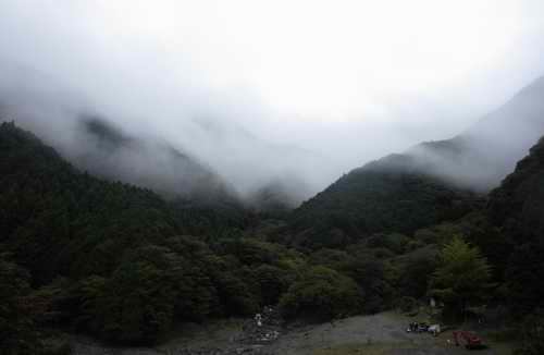 [芋煮会11月28日〜29日\5000宿泊費無料]のポスターが掲示されている作治小屋横の見晴らし台から見通すと、沢に入る支度をしている駐車場の二組のバーティがいるのははっきり見えるが、本流F1付近から上は一面な雲の中で山の陰も無し。予報では雨は止んでいることになっているが、山の中はその通りでは無い可能性も十分あるのではないか。でも、止んだ雨、とりあえず大雨はない。