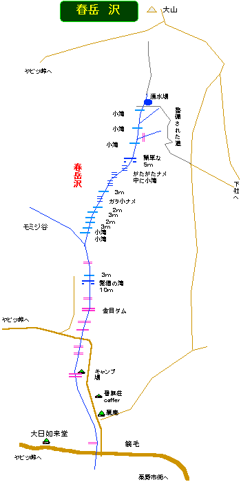 金目ダムを過ぎて参道から沢に降ります。さすがに固有名刺を持つ「髭僧」の滝は堂々としたものです。ダクダクと水が流れ降ります。流れを避け右のカンテに取り付いてみると、春の暖気になじんだ体にとって岩は「きーん」となるほど冷たくて、簡単な岩登りなのに、登り切ると思わず股火鉢。