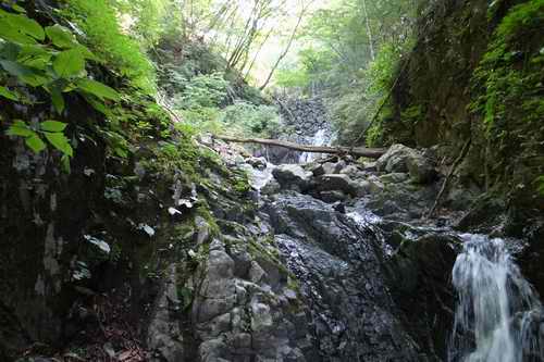堀山の家への登山標識下のヒル用と置かれていた塩をひと摘みポケットの中に入れる。二俣の水量はいままでのなかでは最も少ない方だった。堀山への登山道に入り、三百m先で小草平の沢を渡るところまで行く。周囲全部ロープで進入禁止にしている下流側に30m下って勘七の沢F1下に着く。ここが沢歩きの開始点である。