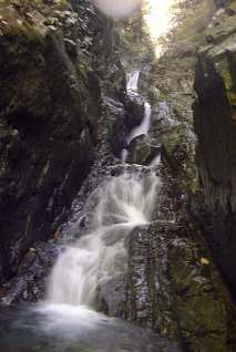 ナメ状をはさんで次は2段の滝だ。下は簡単だが、上の9mは垂直に落ちる滝であり、滝そのものは登れそうもない。どうやって上に行こうか、右側のカンテ状の奥がちょっと気にはなったが、「これはさっさとエスケープするに限る」と少し戻り、左岸の樹林帯を上がるがトラバースできず、上がり詰め、尾根上の堀山下につながる登山道に出てしまう。
