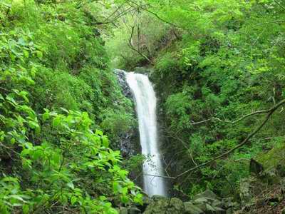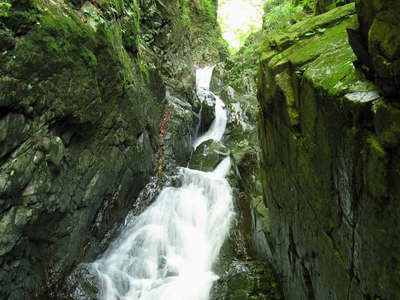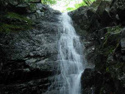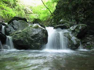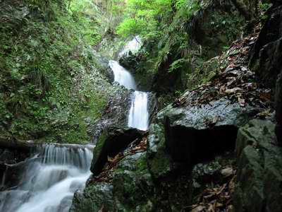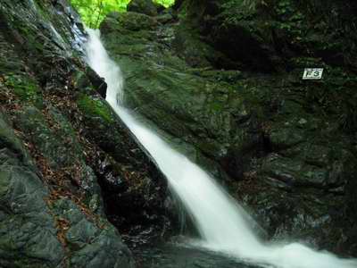 左手に滝をかける小沢が別れる。右手の本流にはゴツゴツした黒い岩の3m程の滝がかかる。その滝を越え、更にもう一つ小滝を越える。