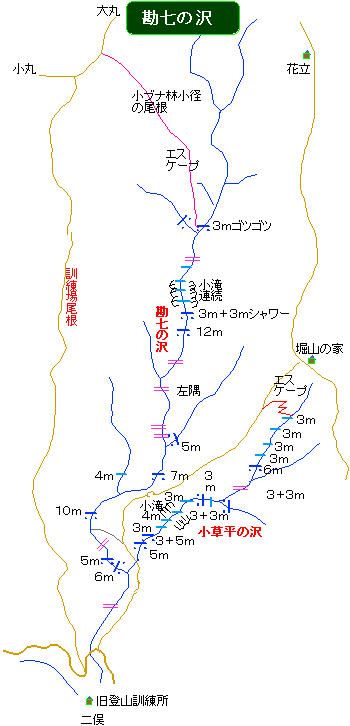 勘七の沢は下の二俣入り口からの登山道が山腹から一旦沢の中に降りてきて、それが小草平の沢と勘七の沢の中間尾根に上がっていく地点の左側に滝があって、