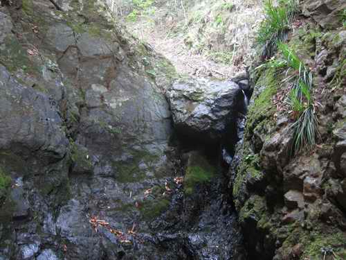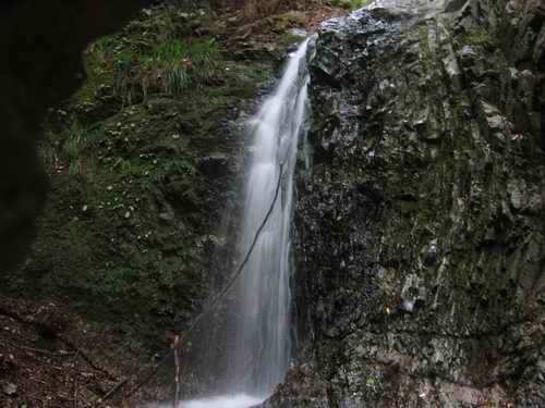 とって返し、左岸から右岸に渡る登山道を渡っていって、そこから奥に10m進むと小草平F1の下へ出る。