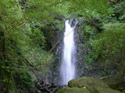 見た第一印象は、その通りに20mは越えようかという大棚に見える。落ち口からは滝場全体に薄く水が広がって華麗に流れ降る。左手には朝の日が当たり輝く。滝口の木々は楓系の葉っぱを広げているから、もしも紅葉の時期にでも、この場所に立とうものなら、すばらしい秋色の景色が楽しめるだろうと思える。そんな風な眺めて美しい滝なのだ。しかし、近づいて見ると美しさは変わらないが25mは無い。精々欲目にみて20mにちょっと足りず、厳しめに計れば15mも怪しい。昔に比べれば上からの瓦礫で数m程は滝壺が埋まって落差が小さくなっているかも知れないし、まあ、そんなことはどうでもよろしいことなんだが、とてもとても登ろうとは思わない。