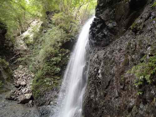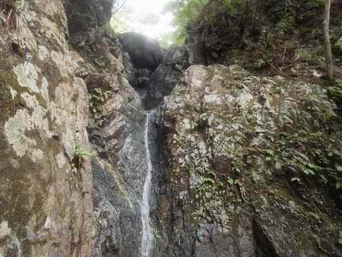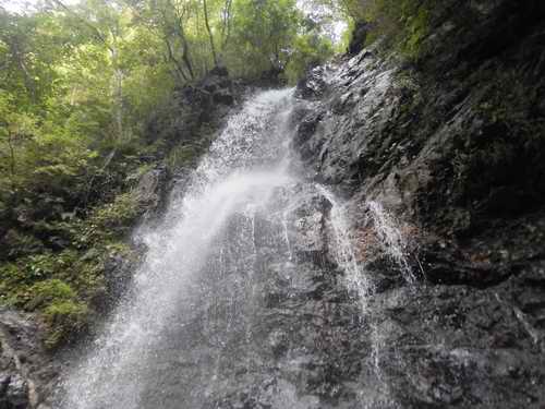 次は6mの滝、垂直だが、落水部の左に凹溝があり、その中に入れば順層の岩場なので高度感はあっても難しくない。