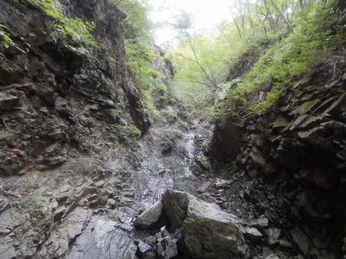 狭くて急で、両岸が開戸の用に左右の風景を立ちきって、残った空間の下部には落ちてきて砕けた石が累々と堆積したルンゼ状となって、上段の隅まで続いている。