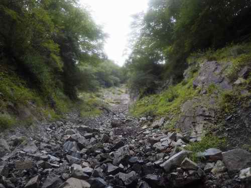この滝が済むとミズヒ沢はしばらく優しい感じの沢に変わる。優しいというのを言葉を換えればナニもない平凡な沢と言い換えられる。いわゆるゴーロ状があって、小石ざくざく・小岩はゴロゴロ。ゴーロの岩が所々では払われて岩床が出て、その岩床が急であれば小滝とはなるが、それに至らない場合が多い。これら全長を平均化して言葉に代えあればゴーロであって、そこから偏りは少ない。巻き道で時間と喰ったから少しだけスピードアップしようか。そうやって焦ると小石の不安定さも確認せずに動くことになる。だから物の見事に足を取られてスッテン、尻を打ってオオ痛々と無く。でも、そんなことくらいでは平凡さから抜け出られないのがミズヒ沢なのだ。